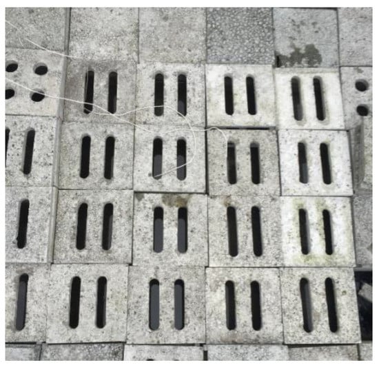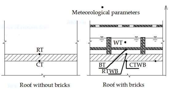 Figure 2 and Figure 3 show the schematic and photo of the field test, respectively. As shown in Figure 2, the water-retained brick is equipped with a movable cover with a strip-hole. The upper layer of the brick stores water, and the lower part is combined with the roof to form an air layer. Moreover, considering the building modulus, the transportation of water-retained bricks and the convenience of construction, the horizontal size of the water-retained bricks is set to 30 × 30 cm. The resolution, range and accuracy of the sensors utilized are given in Table 3.