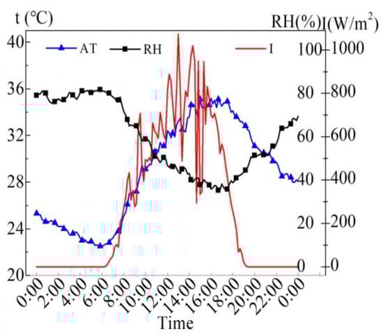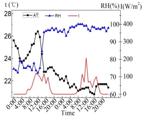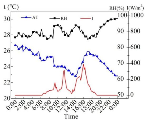Figure 10 illustrates the meteorological parameters on the overcast day of 14 August 2015. It can be seen from the figure that the maximum solar radiation intensity is 391 W/m2, the average solar radiation intensity from 7:00 to 19:00 is 107 W/m2, the average AT of 24 h is 24.7 °C, the highest AT is 26.7 °C, and the lowest AT is 22.7 °C. The average R.H. of 24 h is 90.3%, the maximum R.H. is 98.5%, and the minimum R.H. is 84.9%.