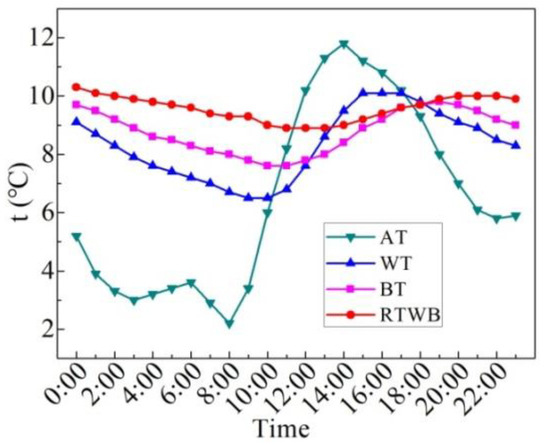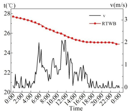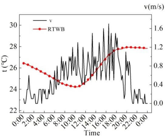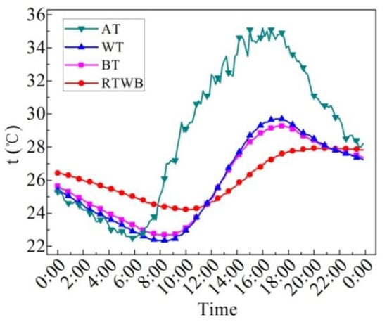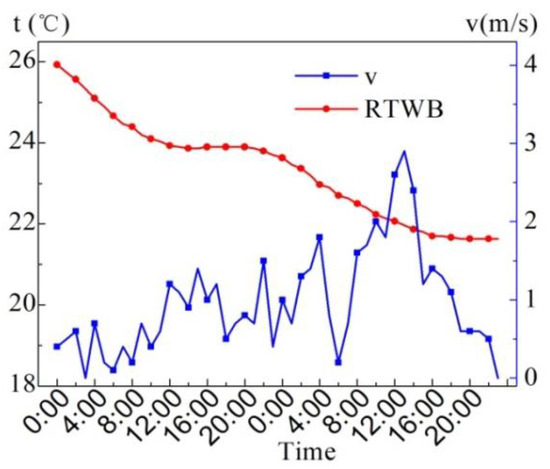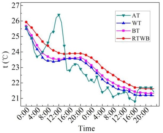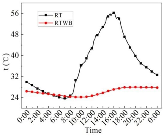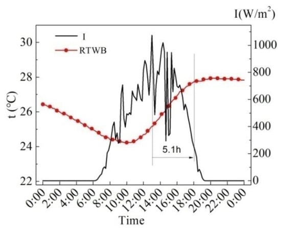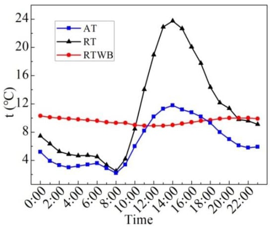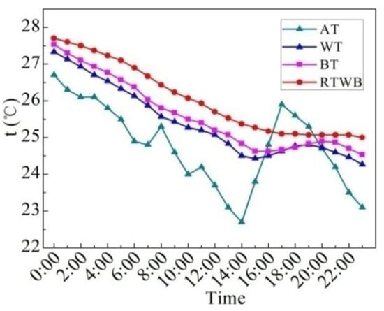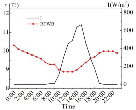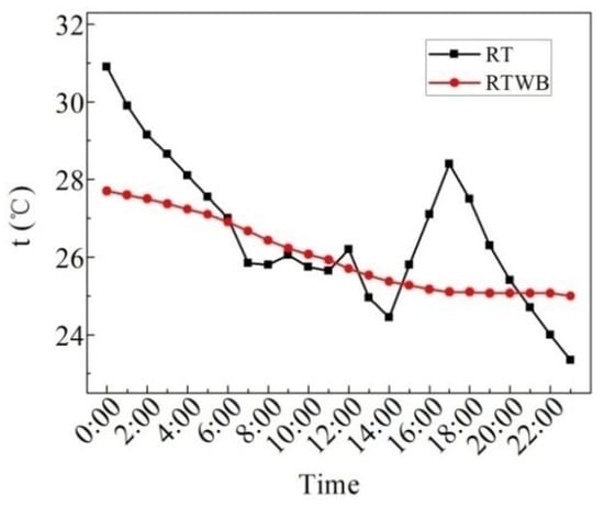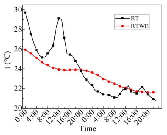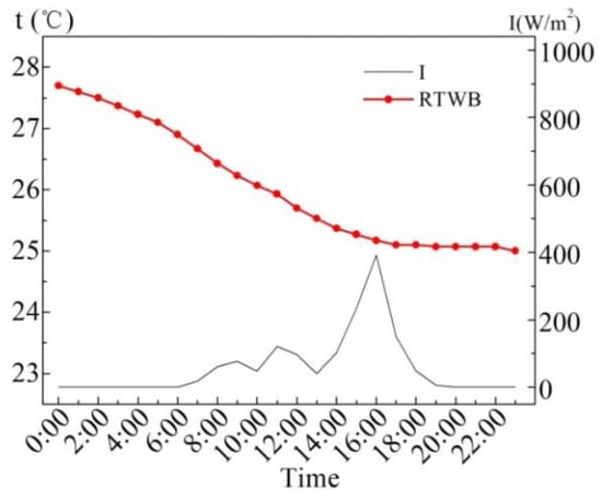 Figure 14 presents the hourly values of RTWB and RT on the overcast day in the summer. As can be seen from the figure, RTWB continues to decrease within 24 h, whereas RT begins to rise at 14:00 after experiencing a decline because the influence of I on RT is significantly greater than that on RTWB. From 20:00 to 24:00, RT is always lower than RTWB, that is, RT < RTWB on the overcast night. In addition, the fluctuation of RTWB within 24 h is less than RT.