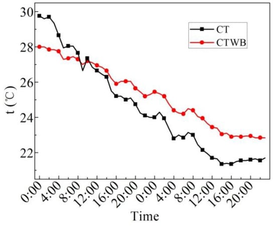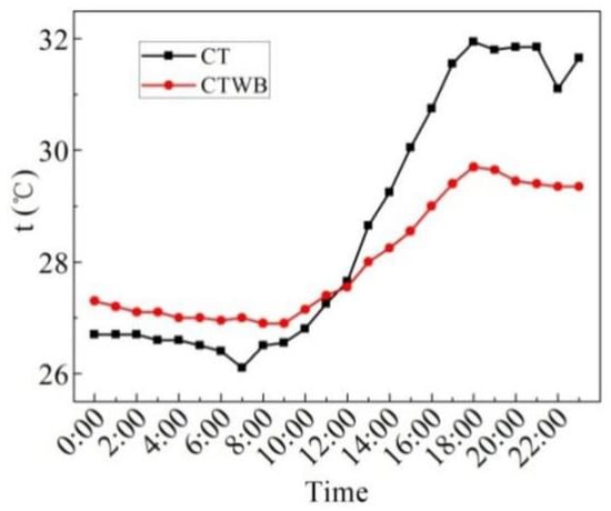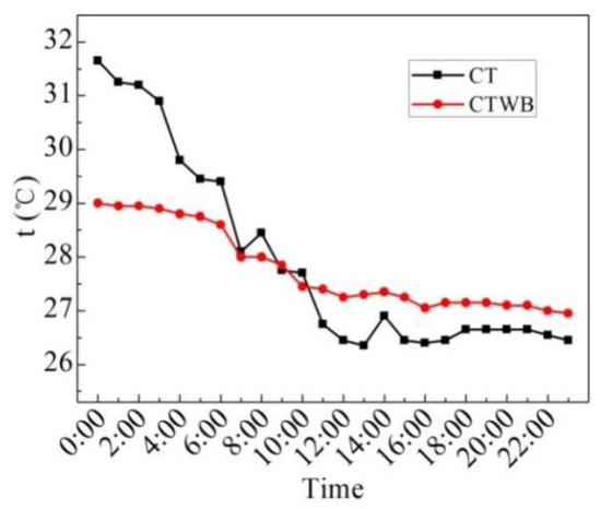 Figure 15 displays the measured values of the CTWB and the CT on the overcast day in the summer. As can be seen from the figure, the average CTWB of 24 h is 27.8 °C, the maximum CTWB is 29.0 °C, the minimum CTWB is 27.0 °C, and the maximum fluctuation of CTWB is 2 °C. In 24 h, the average CT is 28.0 °C, the maximum CT is 31.6 °C, the minimum CT is 26.5 °C, and the maximum fluctuation of CT is 5.1 °C. Moreover, the change in the rule of CTWB and CT with time is quite similar with each other. After laying water-retained bricks, the temperature fluctuation of the ceiling temperature of the rooftop drops by 60.0%, and hence the indoor thermal comfort is improved.