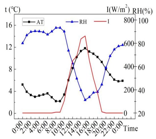 Figure 21 shows the meteorological parameters on February 8. It can be seen from the figure that the maximum solar radiation intensity is 663 W/m2, which appears at 13:00. The period with strong solar radiation intensity is 14:00 to 15:00. The night air temperature (AT) is low and the relative humidity is high; the daytime AT rises gradually with the increase in solar radiation intensity, the relative humidity drops from 90% at 10:00 to the minimum of 31.2% at 15:00, and then gradually rises. The 24 h average AT is 6.5 °C, the maximum AT is 11.8 °C, appearing at 14:00; the minimum AT is 2.2 °C, appearing at 8:00; the AT rises fastest within 9:00–12:00, and it drops fastest within 16:00–21:00, which is related to the change in solar radiation intensity.