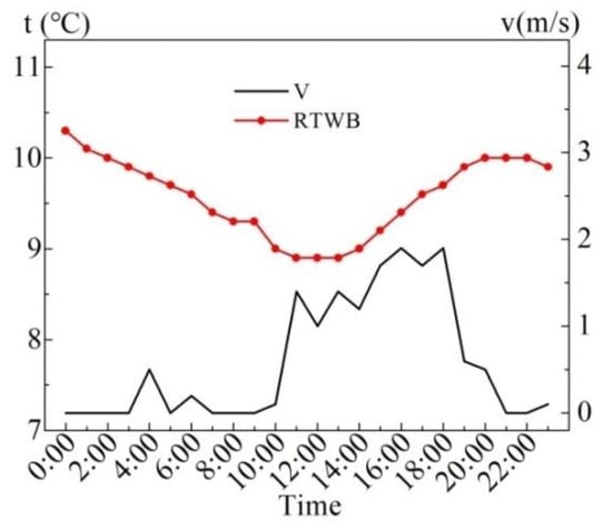 Figure 22 displays the measured values of wind speed (v) and roof temperature under brick (RTWB) in the winter. As can be observed from the figure, it is basically wind-free from 0:00 to 10:00, and the RTWB continues to decline from 10.3 °C to 8.9 °C. Within 11:00–13:00, the RTWB is stable at 8.9 °C, and later begins to continue to rise, reaching the highest temperature at 23:00. When the wind speed is approximately 0 m/s, the RTWB drops continuously, but the RTWB rises when the wind speed increases, which indicates that the increase in wind speed does not play an obvious cooling effect. The temperature transfer of the water-retained brick roof is delayed; therefore, the influence of wind speed on the RTWB has no obvious regularity.