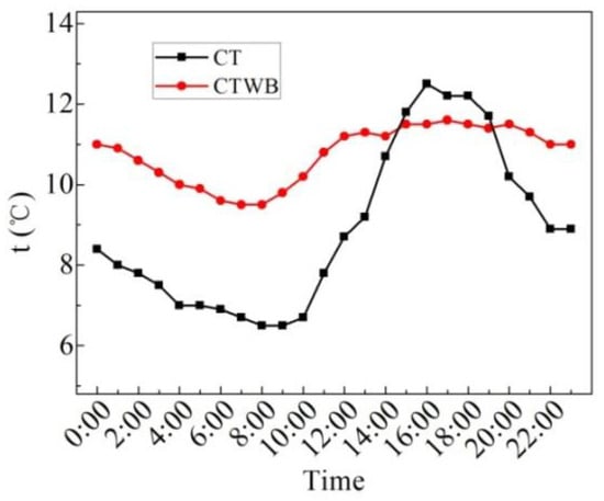 Figure 26 reveals the measured values of CTWB and CT in the winter. It can be seen from the figure that the change in CT and CTWB with time is similar with each other; however, the minimum value of them differs a lot when the time is 8:00. Moreover, the average CTWB is 11.0 °C, the maximum CTWB is 12.8 °C, the minimum CTWB is 9.5 °C and the maximum fluctuation of CTWB is 3.3 °C for 24 h on the sunny day in the winter. The average CT is 8.7 °C, the maximum CT is 12.9 °C, the minimum CT is 5.4 °C, and the maximum fluctuation of CT is 7.5 °C. Although the maximum ceiling temperature of the rooftop with bricks after laying water-retained bricks is the same and even lower than that without laying bricks, the average ceiling temperature of the rooftop with bricks in 24 h can be increased by 2.3 °C, and the fluctuation of the ceiling temperature of the rooftop with bricks is decreased by 56.0%. It can be seen that laying water-retained bricks improves the insulation performance of the roof and indoor thermal comfort.