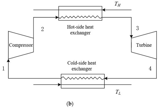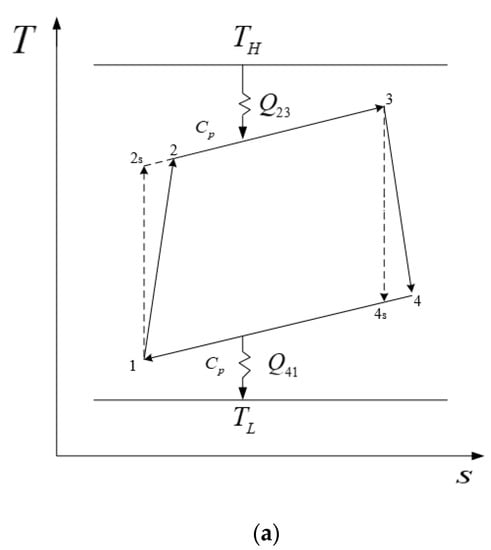 Figure 1a gives  diagram of an irreversible simple CGT cycle with constant-temperature heat reservoirs [,].  (or ) is heat release (or absorption) rate,  (or ) is heat sink (or source) temperature.  is the endoreversible cycle, while  is the actual irreversible one. Figure 1b gives a system diagram of an irreversible simple CGT cycle []. The working fluid changes from states 2 to 3 through hot-side HEX, from states 3 to 4 through irreversible expansion of turbine, from states 4 to 1 through cold-side HEX, and finally from states 1 to 2 through irreversible compression of the compressor to complete the whole cycle.