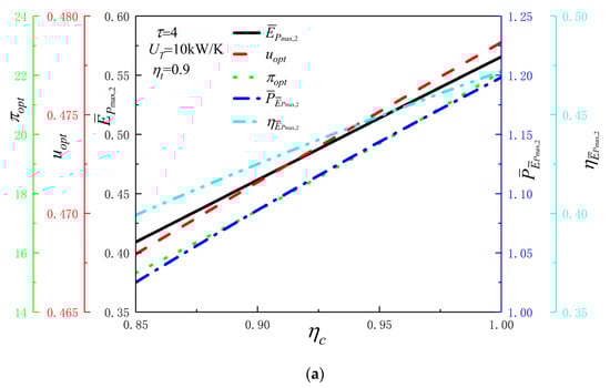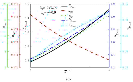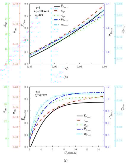Figure 3b reflects the , the corresponding , ,  and  vs.  when , , and . From Figure 3b, as  raises, , , ,  and  raise. When  raises from 0.85 to 1,  raises from 0.3538 to 0.7495, a raise of 111.84%;  raises from 0.4651 to 0.4895, a raise of 5.25%;  raises from 14.7132 to 25.0472, a raise of 70.24%;  raises from 0.9722 to 1.3098, a raise of 34.73%;  raises from 0.3639 to 0.5722, a raise of 57.24%. This reflects that the value of  has a very large impact on the value of , has a greater impact on the values of , , and , and has the least impact on the value of . When  and  gradually raise to 1, the irreversible loss is smaller, and the result is closer to the endoreversible cycle [], so the  and the  also raise, and the  is closer to 0.5. Comparing the effects of  and  on the  performance, it can be found that  has a greater impact on it. Therefore, in the actual project,  improvement should be given priority.