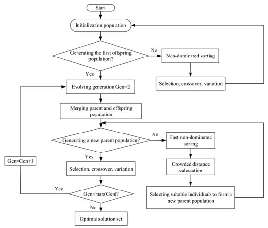 Equations (12) and (16)–(19) are the five performance indicators of irreversible CGT cycle. In actual design, optimization can be carried out according to different requirements, that is, single-objective optimization can be carried out and different objective functions can be combined separately to carry out MOO. In this paper, the NSGA-II is used to implement MOO of the cycle, and three decision methods of Shannon Entropy, TOPSIS and LINMAP are used to select the results with the smallest deviation index (). Figure 4 is an algorithm flowchart of NSGA-II.