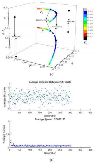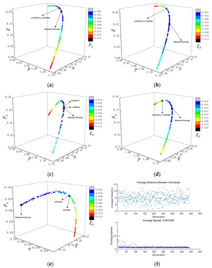Figure 5a reflects the Pareto frontier gained by five-objective optimization (). From Figure 5a, as  raises,  and  first raise and then reduce, nd  and  reduce. Figure 5b is the average distance generation and average spread generation and converges in the 302th generation when , , ,  and  are applied as the OOs for five-objective optimization, and the  acquired by Shannon Entropy approach is 0.2284, which is smaller than the other results. This scheme is more ideal.