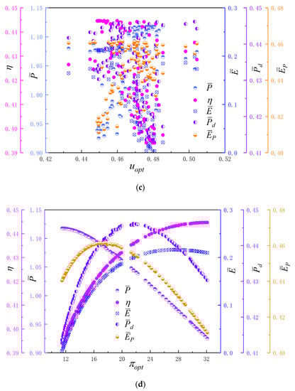 Figure 5c,d reflect the distributions of  and  corresponding to the Pareto frontier during optimizations. From Figure 5c,  is mainly distributed between 0.45 and 0.49; as  raises, the change trends of , , ,  and  are irregular. From Figure 5d,  is mainly distributed between 11 and 32; as  raises,  and  first raise and then reduce,  and  raise, as well as  reduces. All of s corresponding to the maximum  and  are between 15 and 24.