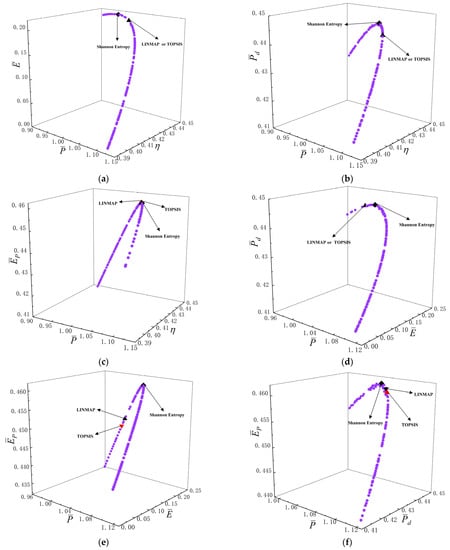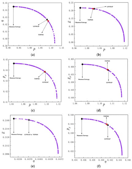 Figure 6a–e reflect the Pareto frontiers under different four-objective combination optimizations. From Figure 6a–d, as  raises, ,  and  first raise and then reduce, as well as  reduces. From Figure 6e, as  raises,  and  first raise and then reduce, as well as  reduces. Figure 6f reflects is the average distance generation and average spread generation and converges in the 393th generation when , ,  and  are applied as the OOs for four-objective optimization, and the  acquired by LINMAP approach is 0.2163, which is smaller than the other results. This scheme is more ideal.