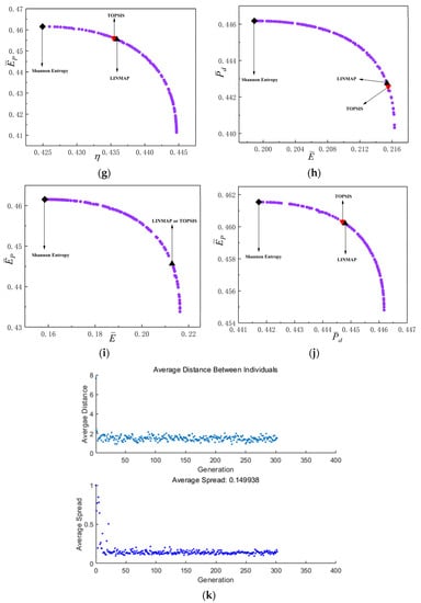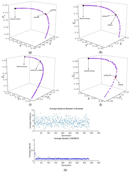 Figure 7a–j reflect the Pareto frontiers under different three-objective combination optimizations. From Figure 7a–f, as  raises, ,  and  first raise and then reduce, and  reduces. From Figure 7g–i, as  raises,  first raises and then reduces, as well as  and  reduce. From Figure 7j, as  raises,  first raises and then reduces, as well as  reduces. Figure 7k is the average distance generation and average spread generation and converges in the 384th generation when ,  and  are applied as the OOs for three-objective optimization and the  acquired by LINMAP approach is 0.2067, which is smaller than the other results. This scheme is more ideal.