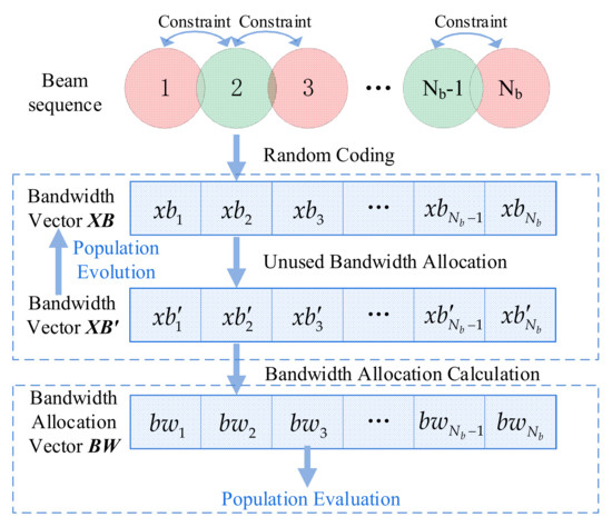 As depicted in Figure 2, the unused bandwidth allocation (UBA) method [20] is utilized primarily to address the bandwidth constraint of invalid solutions. When using UBA, all beams are encoded and optimized, such that all neighboring beam pairs have bandwidth overlap constraints.