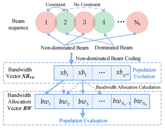Then, a non-dominated beam coding (NDBC) method is proposed to address the shortcomings of the UBA method. We label adjacent rows of beams as dominant and non-dominant beams. The algorithm only encodes and optimizes the bandwidth of the non-dominated beams, and there is no bandwidth overlap constraint between them, such that they can be freely taken in the value domain, which effectively increases the search flexibility and improves the optimization quality of the algorithm. The bandwidths of the dominant beams are then obtained based on the non-dominant beams through a simple calculation. The computational complexity is also reduced, as invalid solutions are no longer repaired.