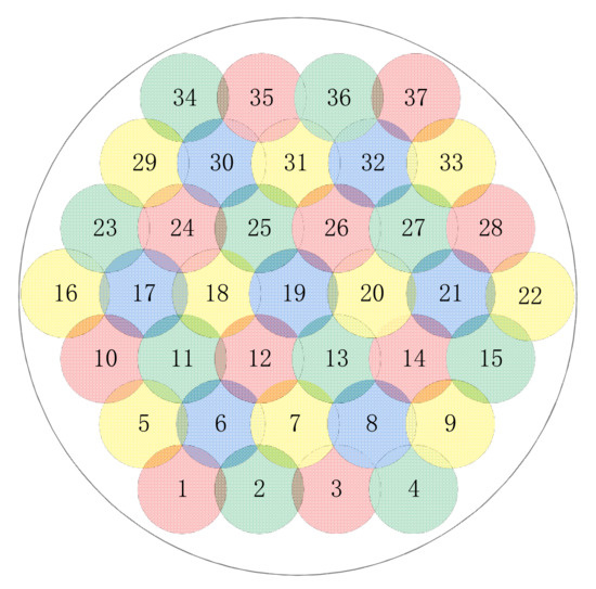 Schematic diagram of the distribution of 37 beams. Using the NDBC method, all red and blue beams (17 in total) are selected as non-dominated beams, whereas all green and yellow beams (20 in total) are dominated beams. The total demand for traffic across all beams is 24.16 Gbps, with a standard deviation of 177 Mbps.