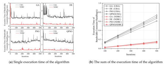 The execution time required for the constraint handling session: (a) constraint handling time of a single execution (with 500 iterations and a population size of 400); (b) total constraint handling time generated by both methods versus the number of iterations (with a population size of 400). The results in the graph demonstrated that NDBC can reduce the execution time of the bandwidth-constrained handling session by 75–80%.