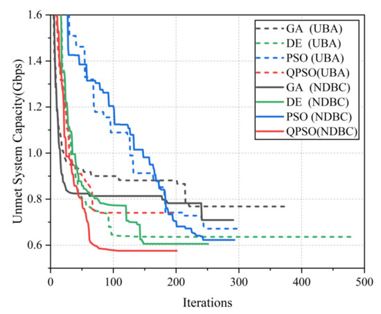 Figure 12b depicts the following phenomena: (1) the metaheuristic algorithm improved the serviceability of the fixed-average algorithm, (2) NDBC can improve the service capability of UBA when the algorithm is GA, and (3) when using NDBC, QPSO can achieve a better solution than GA. Owing to the limited resources, the system service capacity reaches the upper session limit of its service capacity during the peak demand period of the day. In general, the NDBC method proposed in this paper can adapt to continuous-time scenarios.
