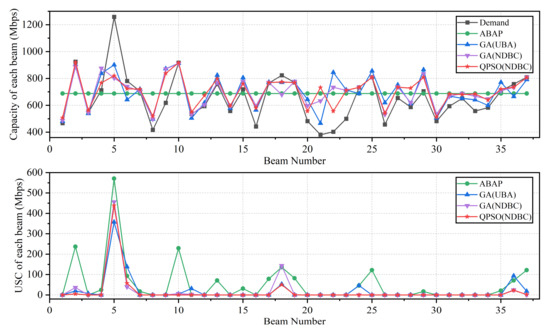 For an efficient comparative analysis, we selected the ABAP algorithm, the GA(UBA) scheme from [20], the comparison algorithm GA(NDBC), and the QPSO(NDBC) algorithm, which applied NDBC most effectively. Figure 10 depicts the capacity allocation and USC outcomes for each beam based on the four previously mentioned algorithms. Using the GA algorithm, NDBC was able to achieve better allocation results for beams 6, 11, 18, 24, and 36 in comparison to UBA. QPSO was able to improve the USC results in beams 2 and 18 using NDBC in comparison to GA. Overall, NDBC reduced resource allocation for high-demand beams, improved USC, and increased allocation fairness.