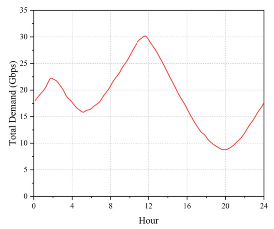Assuming that the geographical characteristics that influence beam demand remain constant, the demand is primarily influenced by temporal characteristics. The demand ratio of each point beam was considered to be identical to the stationary scenario described previously, with a random deviation of 20% or less added to simulate the actual situation. Figure 11 illustrates the total demand, with a sampling interval of 10 min and a scheduling time limit of 3 s. The maximum and minimum number of iterations was 500 and 200, respectively. After 50 iterations, the algorithm terminated if the improvement in the optimized solution was less than .