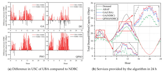As shown in Figure 12a, the USC values of NDBC for all algorithms were superior to those of UBA in the majority of instances, whereas the application of the QPSO and PSO algorithms provided superior results compared to GA and DE. In conjunction with Table 5, it is evident that the stability of PSO and QPSO utilizing NDBC is superior to that of GA and DE (the standard deviations of the average USC were 46, 46, 65, and 64, respectively). We selected the average allocation algorithm (abbreviated as ABAP), the scheme GA(UBA) from [20], the comparison algorithm GA(NDBC), and the QPSO algorithm applying NDBC, with the best results, in order to investigate the service capability of the four aforementioned algorithms in the continuous demand scenario.