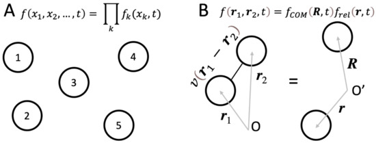 Consider two particles interacting via the potential , where are the coordinates of the particles (Figure 2B). Because of the interaction, the function describing this system in these original coordinates is non-separable:
