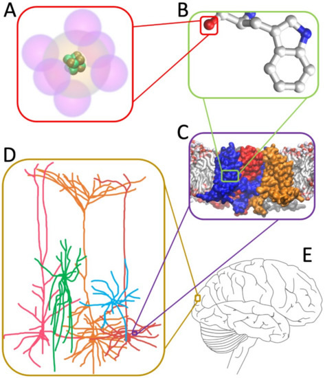 Separability in macroscopic objects such as biological systems. (A) Subatomic particles such as protons, neutrons, and electrons interact stably and with high energy within the atom. Most of their degrees of freedom are effectively separable when considering interactions between atoms, where typically the whole atom can be seen as a single particle, perhaps with additional contributions from “outer” electron shells. The nucleus and the electron orbitals are not shown to scale (the real size difference is about 105). (B) Molecular moieties often have relatively rigid structure and multiple symmetries. Many degrees of freedom from the constituent atoms may be separable from the major molecular motions, e.g., amino acid side chains bend and rotate while maintaining their overall internal structure. (C) In macromolecular complexes immersed in liquids and biological membranes, movements of the numerous constituent molecular residues (e.g., amino acids, lipids, and water molecules) can often be separable from the large-scale dynamics, where many of the relevant degrees of freedom (though not all) may be the rigid-body motions, twists, compressions, and other modes of the macromolecular motions, as well as order parameters of the membrane continuum and concentrations of solutes. (D) At the cellular level, such as when considering neuronal activity, many of the underlying macromolecular phenomena may be separable. Higher-level composite degrees of freedom such as membrane voltage and ionic concentration gradients are in many cases sufficient to describe dynamics at this level. (E) For whole brains, it is likely that details of the activity within individual cells are separable from the larger scale dynamics of the neurons (reflected, e.g., in the somatic output membrane voltage and action potentials) and neuronal ensembles.