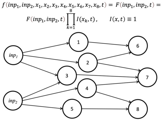 Consider a feedforward system with components (nodes) the states of which are described by variables A set of nodes, with the states described by variables provide inputs into the system and do not receive any connections from the rest of the system (Figure 4). For any node , its state is fully determined by the states of all the preceding nodes that connect to it, and the node has no effect on the preceding variables. This is also true for all the nodes sending connections to node , and then for all the preceding nodes, and so on until we reach the input nodes. Therefore, the value of is fully determined by , and we can replace it by some function,