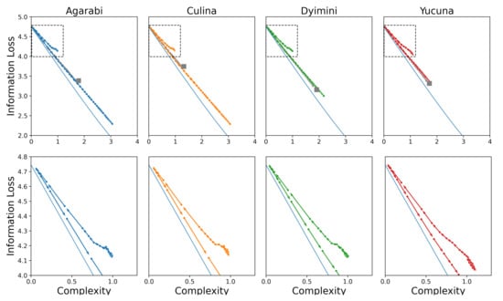 We plot the WCS languages, as scored in the communicative efficiency space, and highlight four typologically diverse languages: Agarabi, Culina, Dyimini, and Yucuna. Similar to Zaslavsky et al. [], we find that natural languages cluster along the frontier.