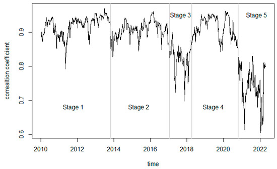 The method proposed by Bai & Perron [72] for global minimization of the residual sum of squares is used to test the mean mutation of the dynamic conditional correlation coefficients. In viewing of the timing of the extreme events mentioned above, the number of mutation points is set to 4 here. The changes in risk spillovers in China’s financial markets during the sample period can be divided into five stages, as shown in Table 2.
