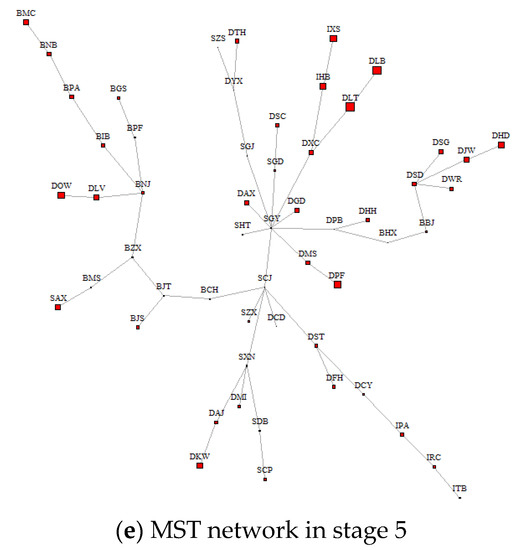 Since the network with the tail correlation coefficient matrix as the adjacency matrix is a fully connected network and the impact of the less correlated parts on systematic risk can be neglected under external shocks [67], the correlation compression that maintains the network connectivity, i.e., the maximum spanning tree (MST), is used here to effectively demonstrate the overall structure of the network.