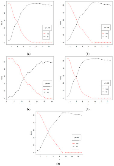 S(t), I(t) and R(t) denote the number of financial institutions in the three scenarios S, I and R, respectively. According to the study sample, S(t) + I(t) + R(t) = 56. We analyze the dynamic evolution of the impact path under different spatial effect parameters based on the five subperiods. In this process, the transition probability α is equal to the spatial correlation coefficient λarea, and the transition coefficient β = 0.01. Assume that only one financial institution node in the financial network is hit at the beginning of the period, i.e., I(0) = 1, S(0) = 56. The dynamic evolution of the impact path of systemic financial risk is shown in Figure 3, and the spatial correlation coefficients from Figure 3–e are 0.809, 0.704, 0.405, 0.833, and 0.691, respectively.