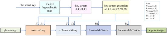 The encryption scheme under study is a permutation–diffusion architecture. It consists of four steps: row shifting, column shifting, forward diffusion and backward diffusion. The row and column shifting can be considered as permutation operations, and the subsequent operations are diffusion. Figure 1 is an overall flowchart of the encryption scheme. The function max() returns the greater number of x and y. The secret key generates encryption elements through the chaotic system for the encryption process.