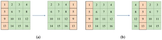 Figure 3. The permutation principle of columns: (a) the permutation principle of the image when and ; (b) the permutation principle of image when and . - Forward diffusionWith the help of generated before, the forward diffusion is implemented according to Equation (5), in which is the forward diffusion result and represents the input image after row and column shifting, ; .