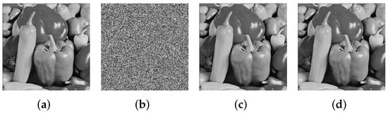 Numerical simulation results: (a) the original pepper image of size and pixel gray values vary from 0 to 255; (b) the encrypted ciphertext image; (c) the recovered image using the chosen-plaintext attack; (d) the recovered image using the chosen-ciphertext attack.