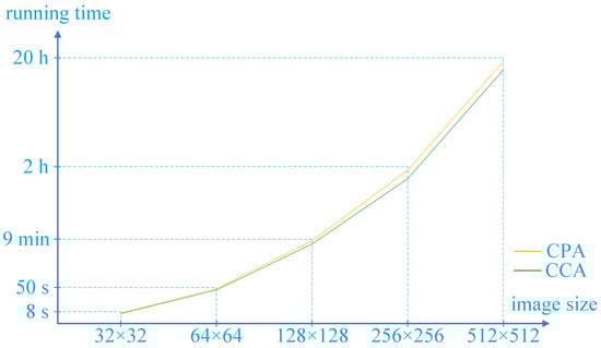 It is found that as the image size becomes greater, the running time of the CPA and CCA increases rapidly. The CPA is a little faster than CCA. This is because the CCA needs to build more complex inputs to obtain the equivalent secret key.