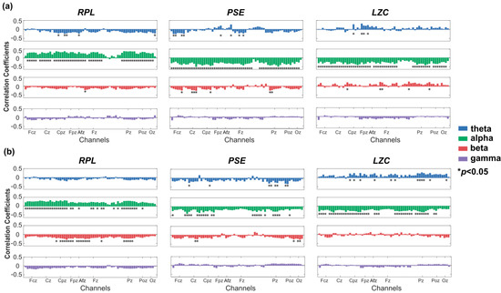 Pearson correlation coefficients between RPL, PSE and LZC, respectively, and both hands/feet MI performance (* p < 0.05). (a) The correlation coefficients were calculated using eyes-open resting-state EEG. (b) The correlation coefficients were calculated using eyes-closed resting-state EEG.