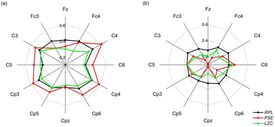 The absolute values of correlation coefficients between Fz, Fc3, Fc4, C3, C4, C5, C6, Cp3, Cp4, Cp5, Cp6, Cpz channels’ RPL, PSE, LZC, respectively, and four classes of MI performance. (a) The correlation coefficients were calculated using open-eyes resting-state EEG. (b) The correlation coefficients were calculated using closed-eyes resting-state EEG.