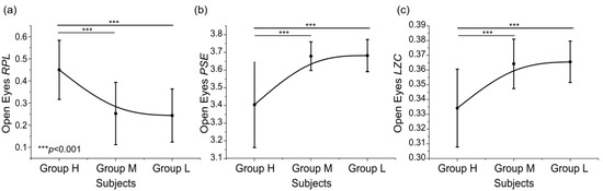 Distribution of RPL (a), PSE (b) and LZC (c) of alpha rhythm in eyes-open resting state among three groups (*** p < 0.001).