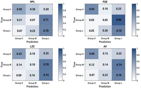 The prediction distribution of the three-class screening model of the MI performance using the RPL, PSE, LZC and all features.