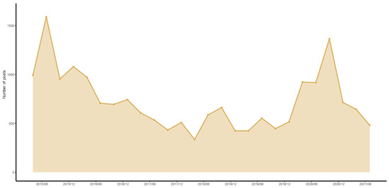 Data was retrieved from the WiseOne Intelligent Data Platform (https://www.wisers.com.cn/en/product/intelligentDataPlatform.html, accessed on 1 September 2022). WiseOne is the world’s largest Chinese media information service provider. With a one-stop solution, it covers more than 1500 mainstream media from mainland China, Hong Kong, Macao, Taiwan, Southeast Asia, Europe, and the United States, with a total of more than 30 million news items and over 500,000 articles updated every month. We collected all news reports from newspapers and periodical journals in mainland China related to E-healthcare from January 2015 to June 2021–in China, newspapers and periodical journals are in the category of traditional media. There are a total of 18,804 reports. Figure 2 shows the number of reports for each month, where temporal variations are clearly observed.