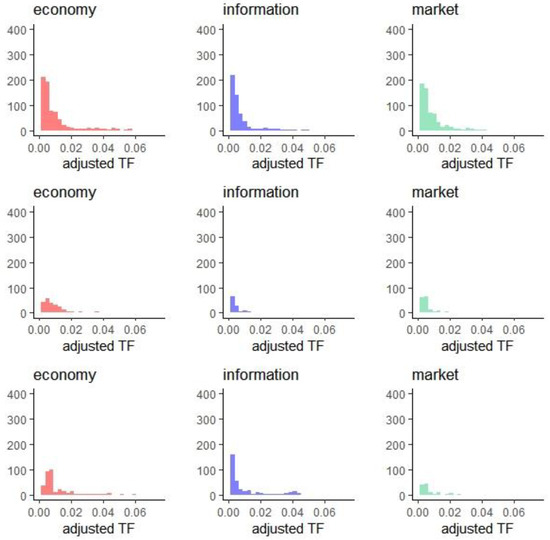Histograms of adjusted term frequency for selected keywords for 2015 Q1 (upper), 2017 Q4 (center), and 2019 Q4 (lower).