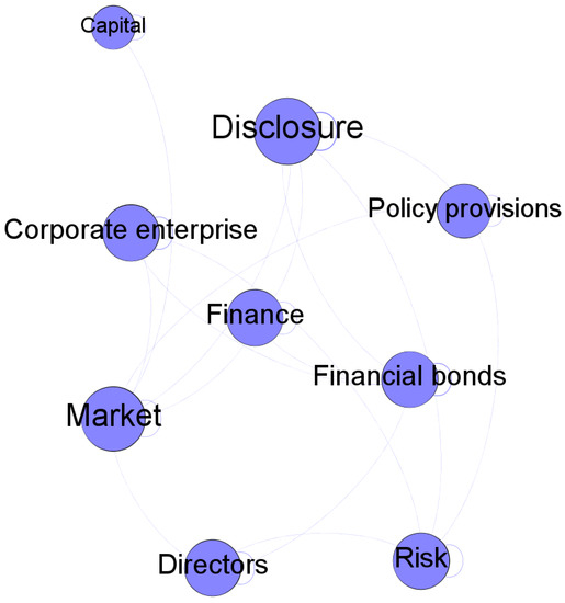 The Louvain algorithm can unfold a complete hierarchical modular structure of a network, thereby allowing for different resolutions of module detection. In Gephi, the resolution parameter, which describes how much between-group edges impact the modularity score, determines the granularity level at which modules are detected [25], with a low-resolution value resulting in more modules. The analysis of associations between words in a module can assist keeping track of semantic structures. The words in the same module are likely to describe tightly connected topics. We extract topics based on semantic structures of the detected modules. For example, most of the words in Figure 5 are related to financial market. As such, this module can be considered as describing financial market. The detected topics can reveal not only debated issues but also interrelationships among objects and attributes transferred from media to the public.