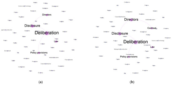 In the policy embryonic period 2015–2016, the media coverage had two phases, and Topic 4: industry management was the main topic. As shown in Appendix A Figure A5, the interrelationships among the words transferred from media to the public were similar in these two phases. The most central hub “Deliberation” was interconnected with “Law”, “Policy provisions”, and “Disclosure”.