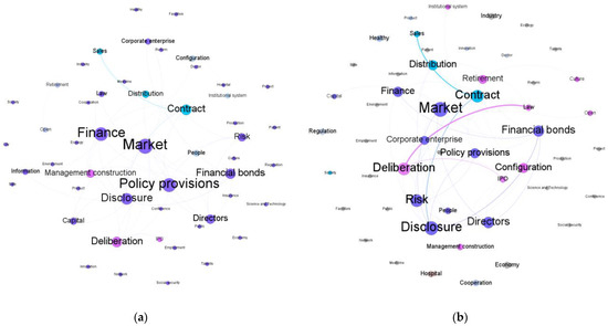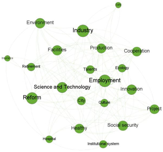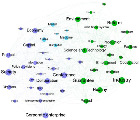 In the policy development period 2017–2019, all the four main topics were detected. Among them, Topic 1: industry development became a debated issue only in 2017 Q3–2017 Q4. As shown in Figure 9, “Industry” was interconnected with “Employment”, “Retirement”, “Talents”, “Reform”, “Facilities”, “production”, “Science and technology”, etc. As shown in Figure A3, in 2017 Q3–Q4, Topic 2 was related to medical sales. “Patient”, “Medicine”, “Distribution”, “Doctor”, “Sales”, and “Market” were interconnected with each other. In 2019 Q3, “Retirement” was interconnected with “Hospital” and “Open”. In 2019 Q4–2020 Q1, “Retirement”, “Culture”, “Configuration”, and “Institutional system” were interconnected with each other. Since 2019 Q3, Topic 2 was mainly about healthcare for the elderly. Topic 3: financial market became a key issue in 2018 Q1. “Finance”, “Financial bonds”, “Risk”, “Market”, ”Policy provisions”, and “Disclosure” were interconnected with each other. Topic 4: industry management was also a key point of discussion. However, the interrelationships among the words changed in the policy development period. “Economy”, “Deliberation”, “Conference”, “Society”, “Risk”, “IPO”, “Finance”, “Capital”, “Law” and “Corporate enterprise” were interconnected with each other in 2017 Q3–2017 Q4. Topic 4 in that phase was related to a wide range of issues. The number of words included in Topic 4 sharply reduced in the remaining phases of that period. For example, only “IPO”, “Deliberation”, “Law”, and “Management construction” were included in 2019 Q3.