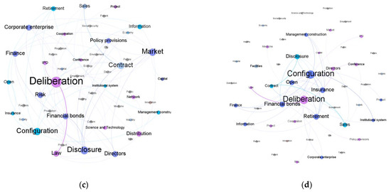 Semantic structure of Topic 4 (2019 Q3–2021 Q2). (a) 2019 Q3. (b) 2019 Q4–2020 Q1. (c) 2020 Q2. (d) 2020 Q3–2021 Q2.