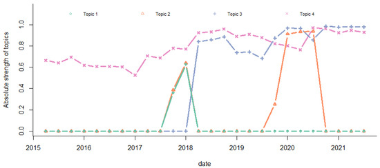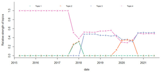 The absolute and relative strengths of the four main topics over time are plotted in Figure 10 and Figure 11, respectively. We observed that the absolute strength of Topic 4 increased over time. It had the highest level before 2019 Q3. Topic 3 surpassed Topic 4 from 2019 Q3. The absolute strength of Topic 1 was the lowest. In 2019 Q4–2020 Q2, the strength levels of Topic 2, Topic 3, and Topic 4 were similar. The relative strengths had the same pattern.