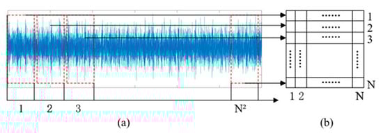 In STIM [], the raw 1D signal is translated into 2D gray image directly as shown in Figure 1. Gray images are obtained by filling the pixels through the original signal sequentially. Once the length of the data is determined, the size image is acquired. Let be a set of different data. . is the pixel value of gray pictures. The specific process is expressed as follows: