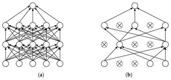 From the former analysis, a dropout layer is adopted after the fully connected layer to overcome the overfitting caused by limited data. The procedure of dropout is demonstrated in Figure 2. Figure 2a shows the standard neural network, and Figure 2b presents the neural network after applying dropout. During forward propagation, several neurons are randomly hidden with a certain probability and excessive mutual adaptation between neurons is prevented.