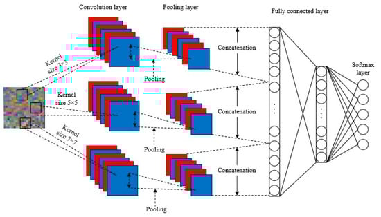 In this subsection, a novel MCMS-CNN is established, and the overall architecture of the MCMS-CNN is graphically illustrated in Figure 4. In the proposed MCMS-CNN, three convolution kernels of different scales are selected, and each scale of convolution kernel corresponds to a channel to perform convolution operations in parallel to extract the features of the RGB fault image at different scales. Although the three convolution calculation channels are parallel and mutually independent, they share hyperparameters during network training. To learn more abstract features from the input RGB images, the kernel sizes with different channels should cover a large range. The size of the convolution kernel should satisfy the following: