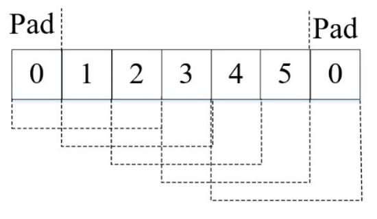 In the zero-padding method, zeros are automatically added to the convolution process. An instance of zero padding in one dimension is shown in Figure 5. The stride of the convolutional layer is set to 1. The parameters are and the padding results are . With the above method, the outputs of different scale convolution kernels are controlled at the same size.
