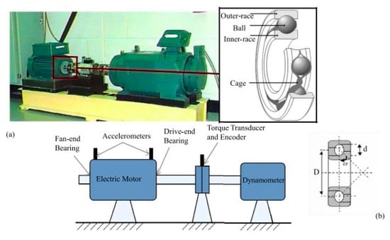 As one of the most critical components of a rotary mechanical system, the malfunction of rolling bearings seriously influences the reliability and the stability of equipment or even threatens equipment running time and human safety []. In actual industry, the heat-generation rate of cylindrical roller bearings, the damage of rolling bearings, etc., can greatly affect the operation status of industrial systems [,]. Therefore, the accurate and feasible diagnosis of bearing faults is essential in modern industry [,]. Various bearing-fault-diagnosis methods have been studied in the academic and engineering fields. In general, the methods can be simply divided into model-based and data-driven approaches []. Model-based methods strongly depend on physical process knowledge. Specifically, a complex industrial system usually has the comprehensive characteristics of strong coupling, time delay, and multiple parameters. Establishing an accurate analytical models when the system is complicated is often impossible. For modern complex mechanical equipment, considerable nonlinear and high-dimensional data can be collected from many kinds of sensors. Data-driven methods only depend on the historical data for the process and extract the useful features from the state of the process. These extracted features can be divided into time domain, frequency domain and time-frequency domain features. Time domain features mainly focus on the analysis of the statistical values of a vibration signal. In ref. [], the sensitive statistical values for different bearing-fault locations are clearly discussed. Frequency domain features mainly consider the frequency domain components of the signal, such as its spectrum. Wavelet transform and empirical mode decomposition are usually adopted to obtain time-frequency features. Therefore, data-driven fault-diagnosis methods are becoming appropriate even for complicated systems.
