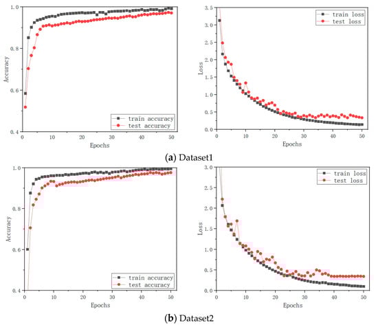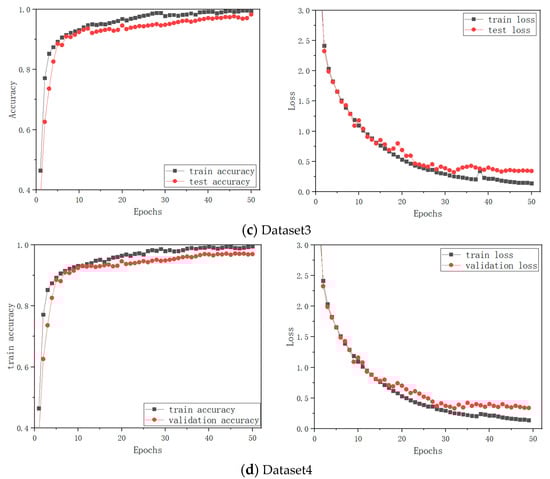 In case of dataset4, the comparison experiments are conducted under the condition that the experimental environment, the experimental parameter settings, and the dataset all remain unchanged. To highlight the difference in the experimental results, the accuracy coordinates of the training and testing set are adjusted to an interval of 0.6–1, and the loss function curves are adjusted to an interval of 0–3, as shown in Figure 11.